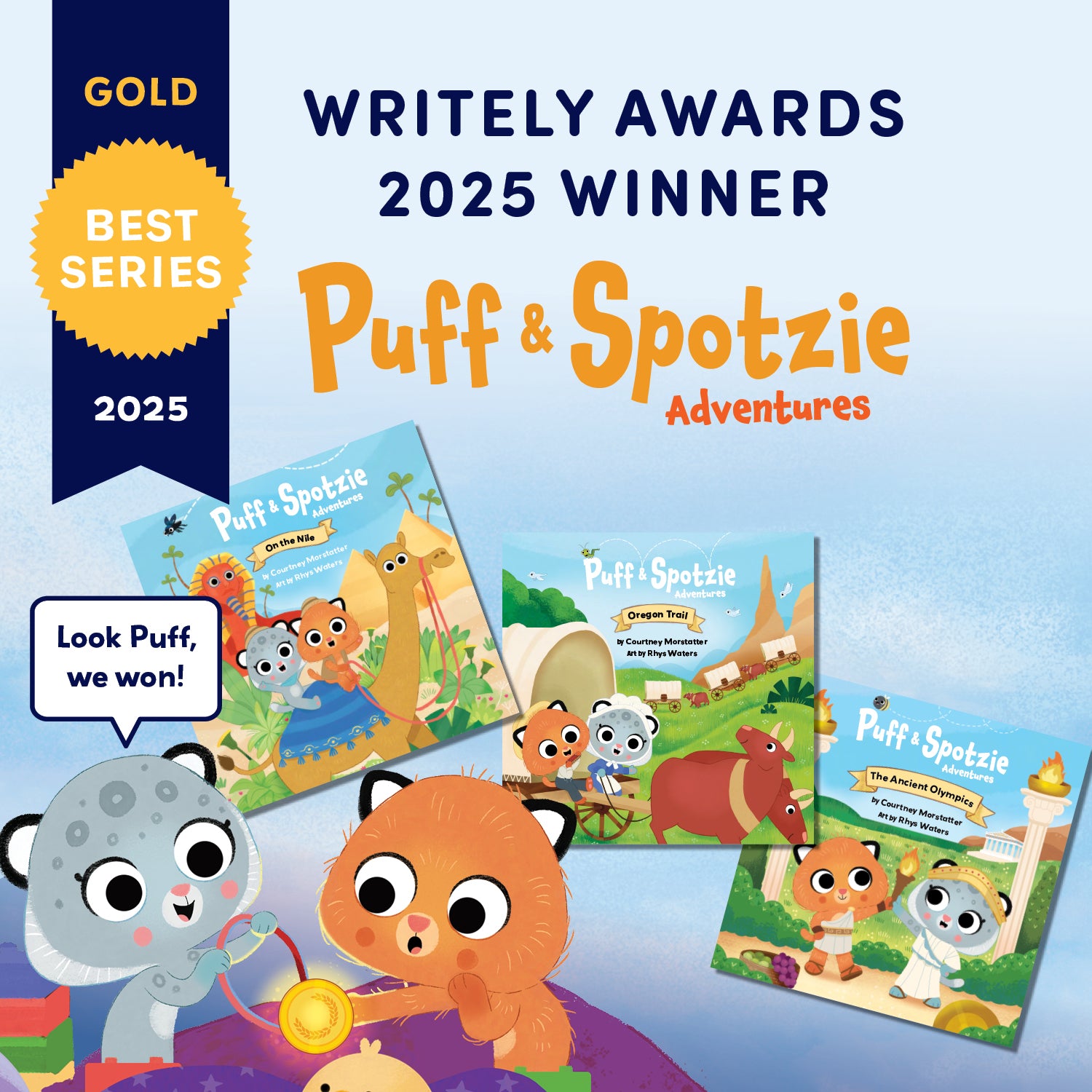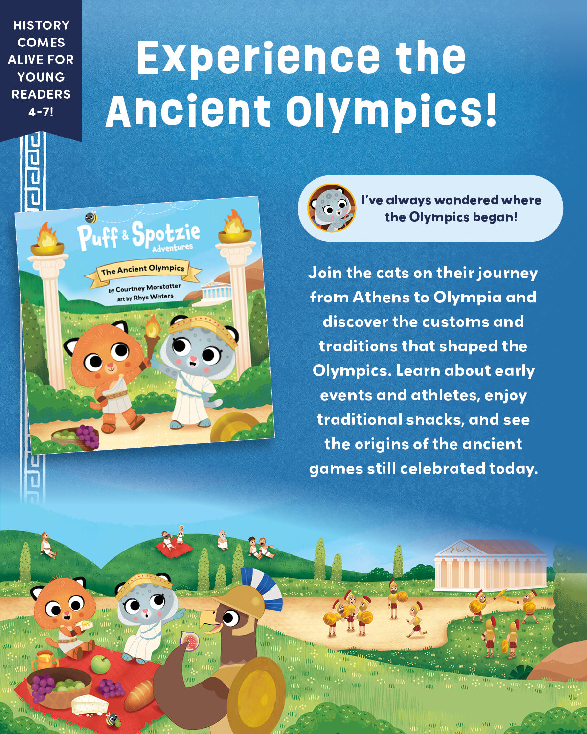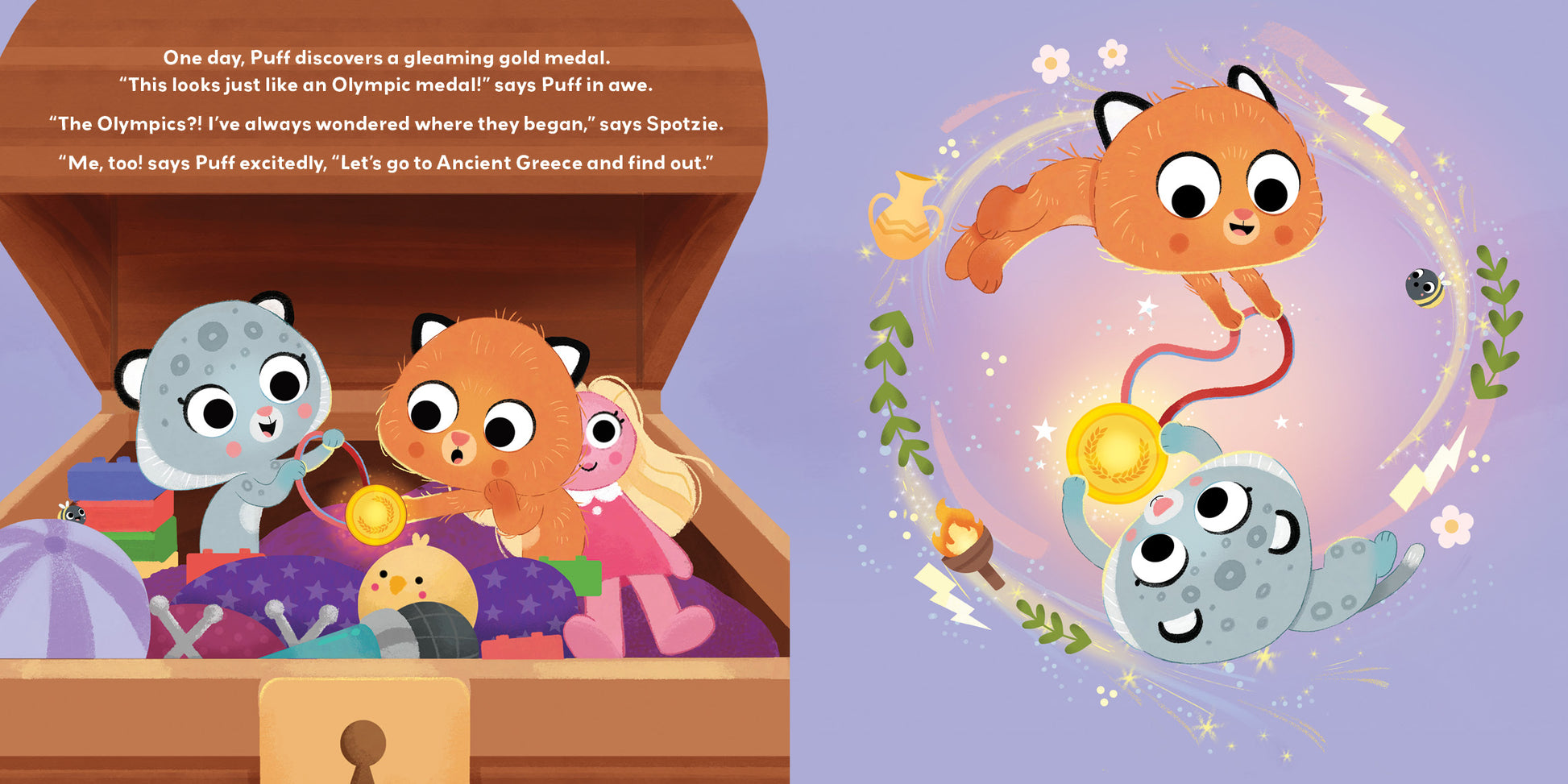 Join Puff & Spotzie, two loveable cats and best friends with a magical secret — the toys in their toybox transport them back through time! When an Olympic medal  whisks them away to ancient Greece, they meet Aquila who guides them on their journey to Olympia, the birthplace of the games. The cats learn all about the rituals and traditions of the early Olympics, some of which are still practiced today. They also learn about some of the events and athletes celebrated long ago.  Puff & Spotize and the Ancient Olympics shows kids how historical events still impact how we live today.