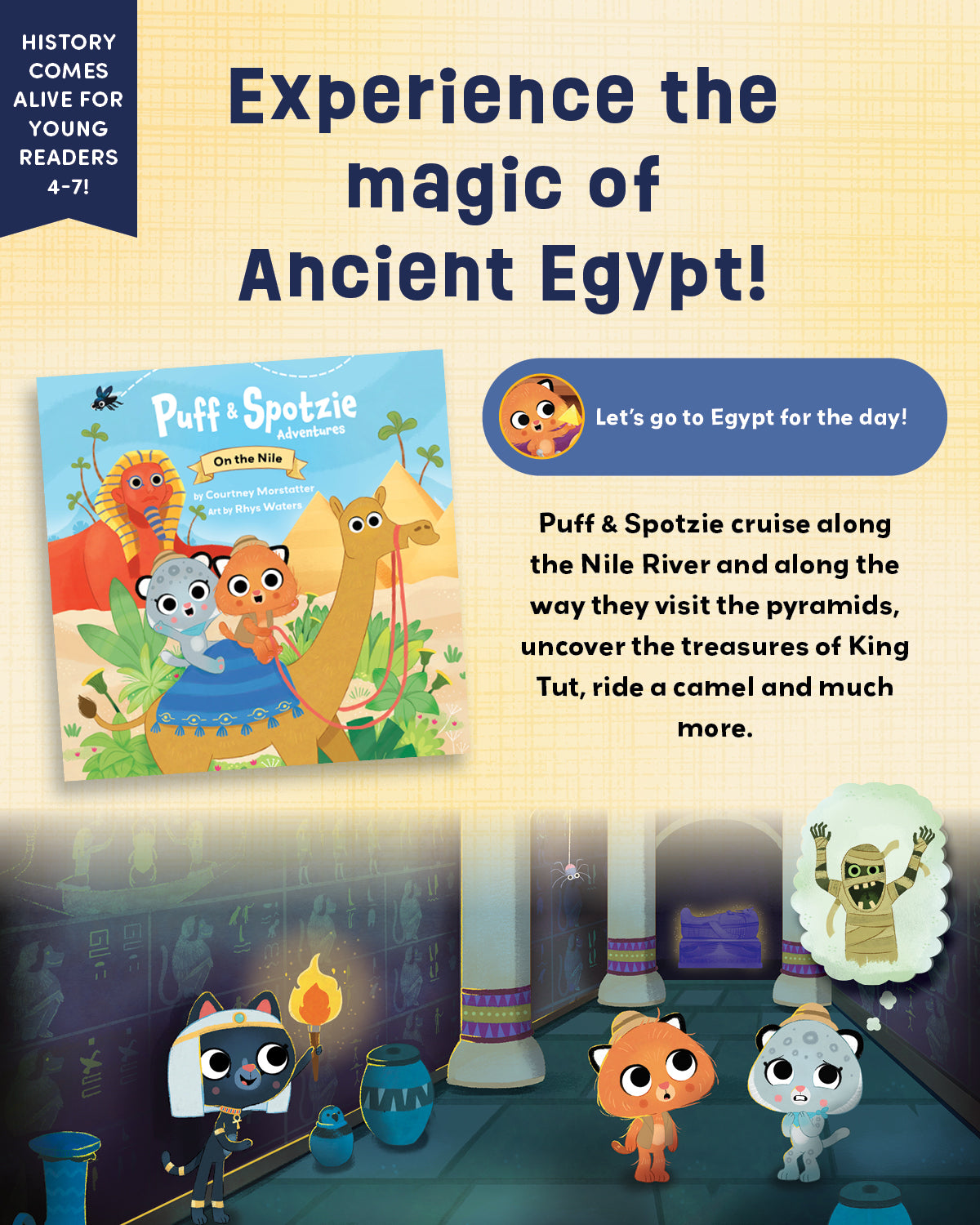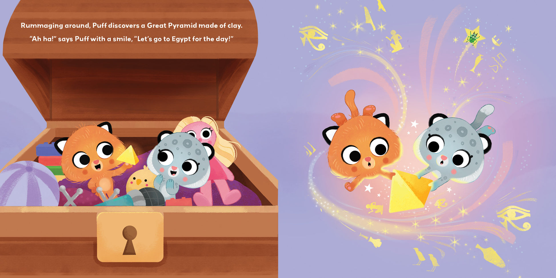 Join Puff & Spotzie, two loveable cats and best friends with a magical secret — The toys in their toybox transport them back through time! When a clay pyramid whisks them away to Ancient Egypt, they embark on a fantastic journey, discovering the wonders of mummies, pyramids, the Great Sphinx, and more.
